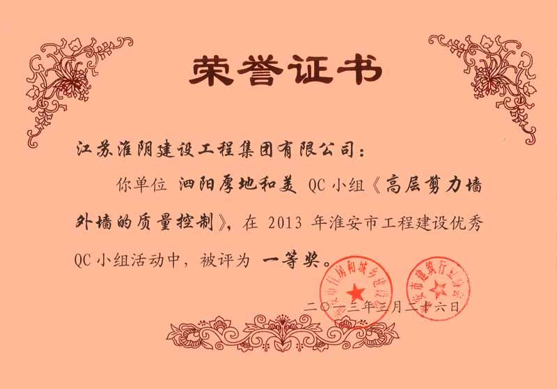 2013年度全国工程建设优秀质量管理小组二等奖(泗阳厚地和