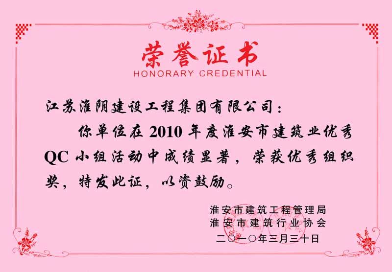 2010年市QC(优秀组织奖)2010年度淮安市建筑业优秀QC小组活动