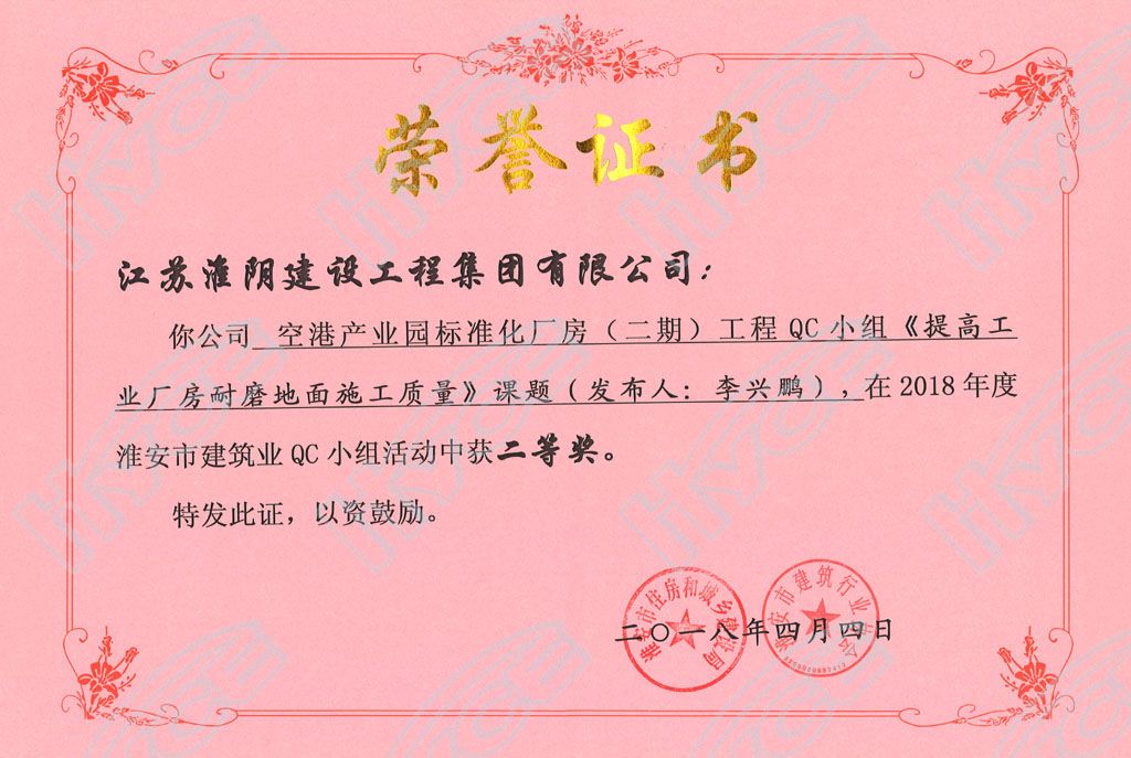 淮安市建筑业QC小组二等奖-空港产业园标准化厂房(二期)